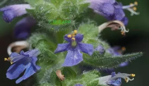 草本, 直立, 有时具匍匐茎, 高I5-40厘米或稍高。茎四棱形, 有槽, 被疏柔毛或老时近无毛,基部略木质化,幼部被浓密的白色长柔毛。叶柄长2-5厘米或更长,具狭翅,有时呈紫绿色,被疏柔毛;叶片纸质,倒披针形、卵状披针形或椭圆状卵形,长4-10厘米,宽1.8-4.5厘米,有时长达15厘米,宽达6.5厘米,先端钝或急尖,基部楔形,下延,边缘具波状齿或不规则的波状圆齿,具缘毛,两面被长柔毛或糙伏毛,下面以脉上为多。轮伞花序具6-12花,多数在茎、枝中上部着生,渐向上而密集,组成穗状花序;苞叶下部者与茎叶同形,但较小,上部渐变小,呈苞片状,卵状披针形,稍超出轮伞花序;花梗极短或几无。花萼漏斗状,长5-6毫米,外面在脉上及萼齿被长糙伏毛,内面无毛,具10脉,萼齿5,卵形或阔卵形,长为花萼的1/3或略短,边缘具灰白色长柔毛状缘毛。花冠蓝色、蓝紫色或紫色,筒状,长7-9毫米,斜出,近中部略弯曲,外面被疏柔毛,内面近基部有毛环,冠檐二唇形,上唇长圆形,直立,先端2浅裂,裂片近卵形,下唇伸长,3裂,中裂片狭心形,先端微缺,侧裂片与上唇等长或略长,长圆形。雄蕊4,二强,伸出花冠很多,弯卷,花丝无毛。花柱细弱,伸出花冠很多,弯卷,无毛,先端2浅裂,裂片细尖。花盘环状,裂片不明显,前面呈指状膨大。子房4裂,无毛。小坚果倒卵状三棱形,背部具极显著的网状皱纹,腹部具果脐,果脐占腹面的2/3-3/4。花期1-3月,果期3-5月或略晚。