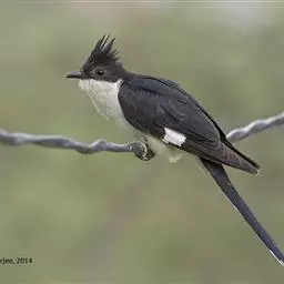 斑翅凤头鹃: 成鸟具羽冠,上体及头侧、翅、尾等黑色,具铁绿色亮辉,尾羽端部具白斑,两侧者形宽,…