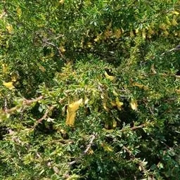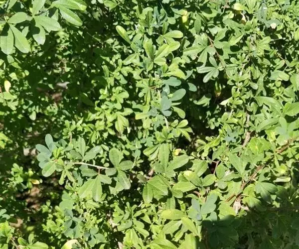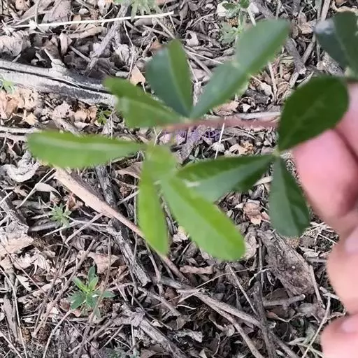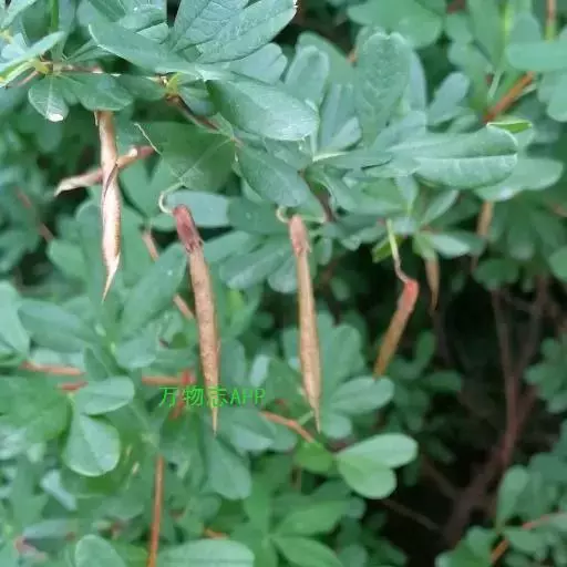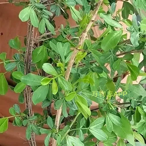 灌木,高1-2米。树皮深褐色;小枝有棱,无毛。托叶三角形,硬化成针刺,长5-7毫米;叶轴脱落或硬化成针刺,针刺长7-15(25)毫米;小叶2对,羽状,有时假掌状,上部1对常较下部的为大,厚革质或硬纸质,倒卵形或长圆状倒卵形,长1-3.5厘米,宽5-15毫米,先端圆形或微缺,具刺尖或无刺尖,基部楔形或宽楔形,上面深绿色,下面淡绿色。
