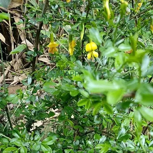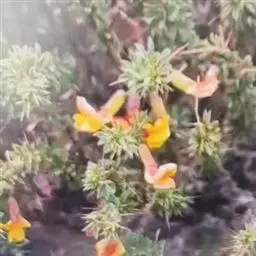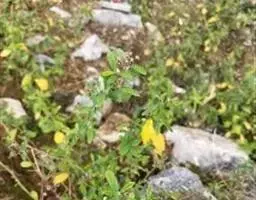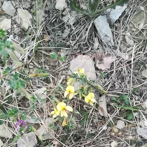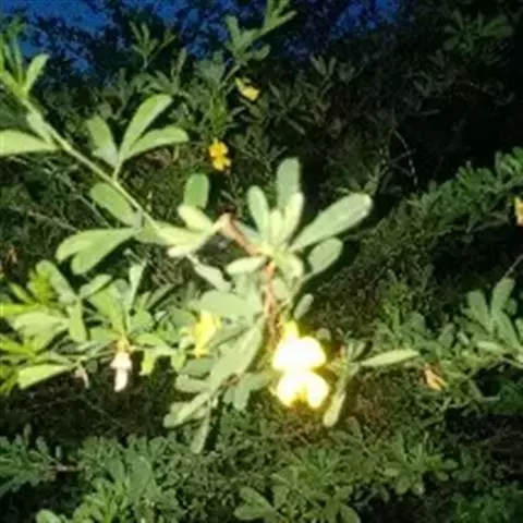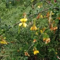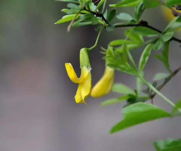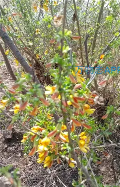 花单生,花梗长约1厘米,中部有关节;花萼钟状,长12-14毫米,宽6-9毫米,基部偏斜;花冠黄色,常带红色,长2.8-3厘米,旗瓣狭倒卵形,具短瓣柄,翼瓣稍长于旗瓣,瓣柄与瓣片近等长,耳短小,龙骨瓣宽钝;子房无毛。荚果圆筒状,长3-3.5厘米,宽约5毫米。花期4-5月,果期7月。