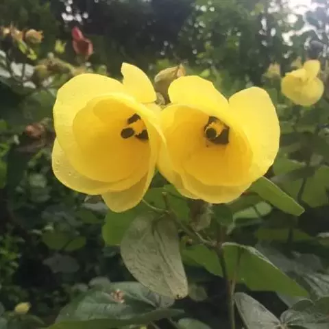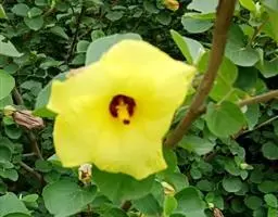 花单,生于叶腋,近无梗;小苞片8-12,红色,肉质,披针形,长5-10毫米,宽2-3毫米,疏被长硬毛,近顶端具刺状附属物,基部与萼合生;花萼杯状,淡紫色,直径约1厘米,疏被刺和粗毛,基部1/3处合生,裂片5,三角状渐尖形,长1-2厘米;花黄色,内面基部深红色,直径6-7厘米。蒴果卵球形,直径约1.5厘米,密被粗毛,果爿5;种子肾形,无毛。花期夏秋间。