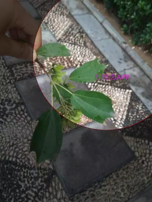 叶纸质,基部近于圆形或楔形,外貌椭圆形或倒卵形,长6-10厘米,通常浅3裂,裂片向前延伸,稀全缘,中央裂片三角卵形,急尖、锐尖或短渐尖;侧裂片短钝尖或甚小,以至于不发育,裂片边缘通常全缘,稀具少数锯齿;裂片间的凹缺钝尖;上面深绿色,下面黄绿色或淡绿色,被白粉,略被毛,在叶脉上较密;初生脉3条,稀基部叶脉也发育良好,致成5条,在上面不显著,在下面显著;侧脉通常在两面都不显著;叶柄长2.5-5厘米,淡紫绿色,细瘦,无毛。