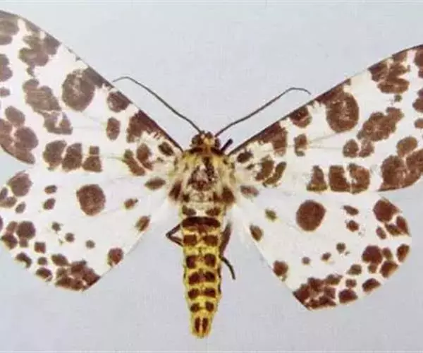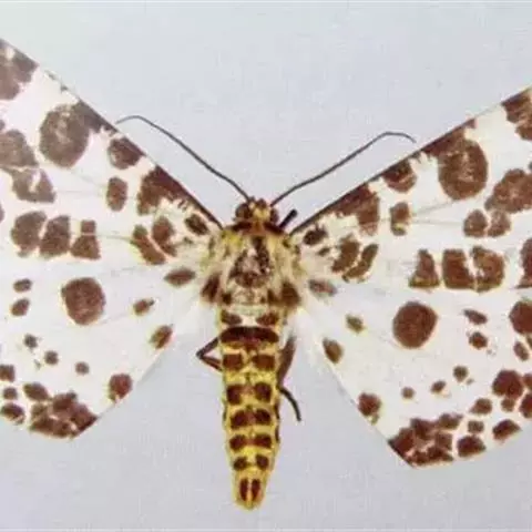翅白至灰白色,前翅前缘浅灰色。斑点黑色,中点远大于其他斑点.夕卜线和亚缘线在和M脉之间的斑点较同列其他斑点略大;亚缘线和缘线2列斑点整齐。翅反面颜色斑点同正面。