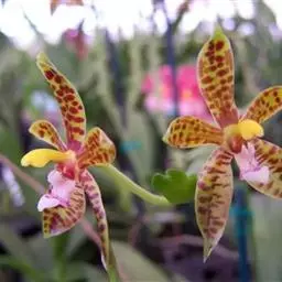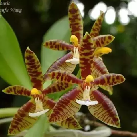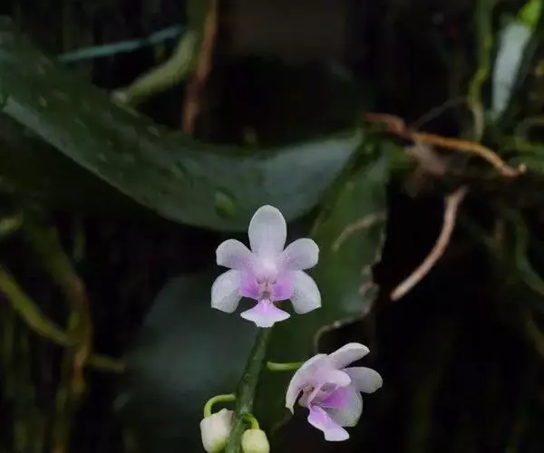 大尖囊兰(学名:Kingidium deliciosum (Rchb. f.) Sweet):根簇生,扁平,长而弯曲。茎短,长1-1.5厘米,具3-4枚叶。叶二列,纸质,倒卵状披针形或有时椭圆形。花序斜出或上举,上部常分枝;密生数朵小花;开花时具叶,萼片和花瓣浅白色带淡紫色斑纹;花瓣近倒卵形,长5-5.5毫米,宽2.7-3毫米,先端钝,具3条脉;唇瓣3裂,基部无爪。花期7月。