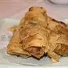 2.将春饼皮子放在案板上,放上肉丝馅,卷拢,两头折拢,最后卷成约二寸六分长、八分宽的小长方形包,用面粉封口。