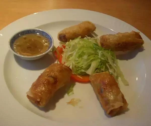 据说宋时福州有个书生,为了温书应试,整天埋头攻读,常常废寝忘食。他的妻子三番五次劝他也没用;就想了个办法:把米磨制成薄饼,以莱肉为馅,包成卷筒形,既当饭,又当莱。这种小吃后来定名为春卷,并逐渐流行于城乡各地。福州人春节期间常常食用,跟北方过节包饺子一样普遍。蔡襄曾写诗赞说:"春盘食菜思三九"。 当今春卷皮已改用面粉,馅一般用豆芽、韭菜、豆腐干,有的还放上肉丝、笋丝、葱花等,较高级的春卷则用鸡丝或海蛎、虾仁、冬菇、韭黄等制作而成。春卷用微火油炸至金黄色,外酥内嫩,又称为"炸春"。