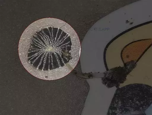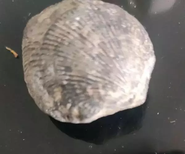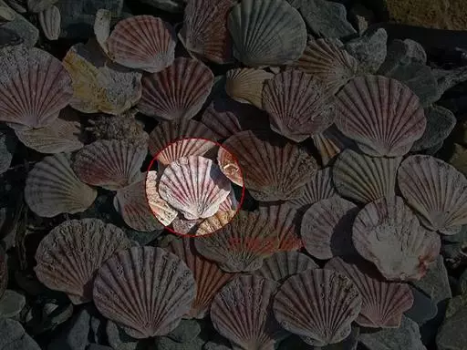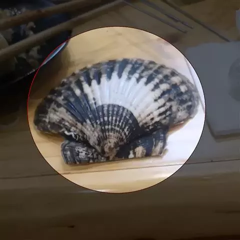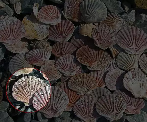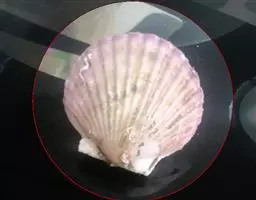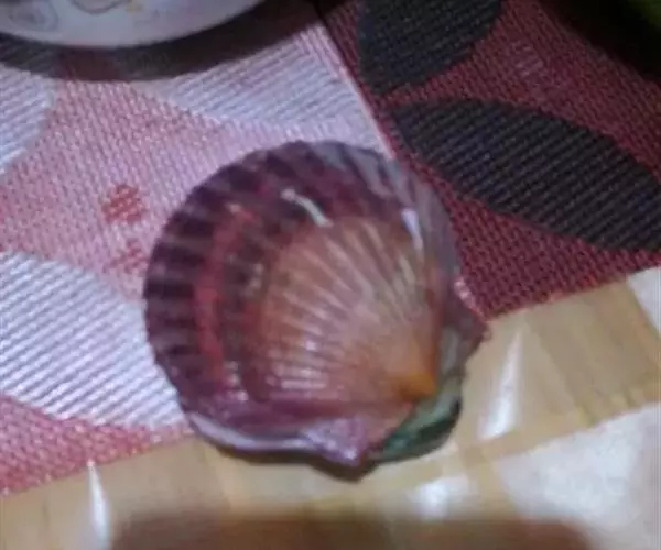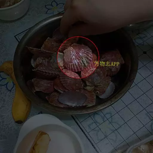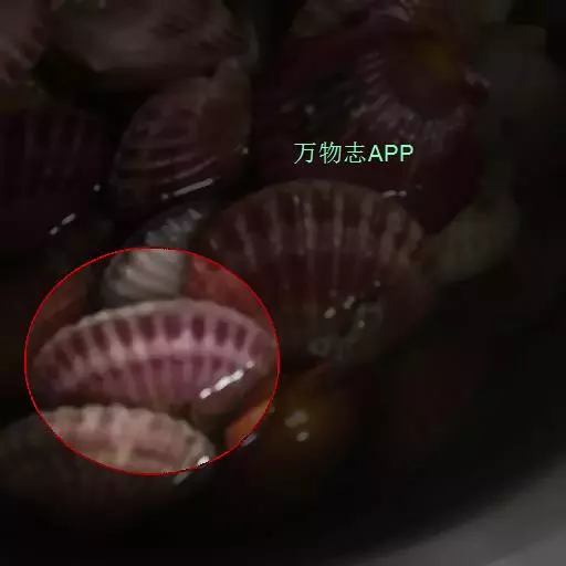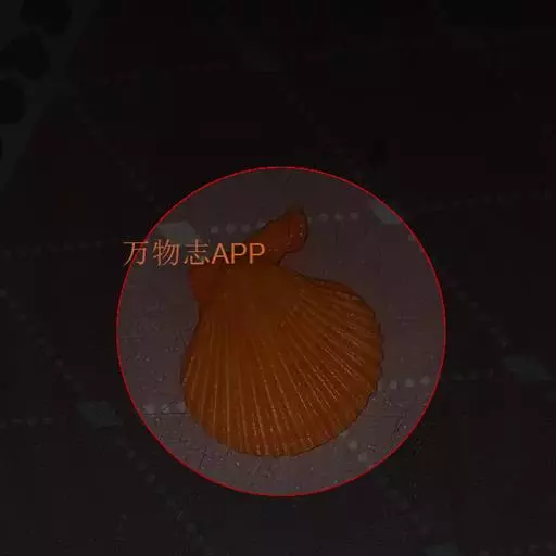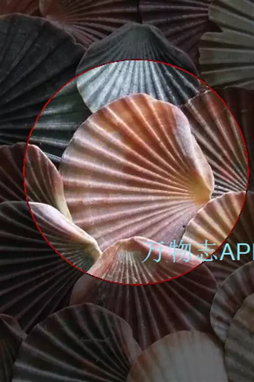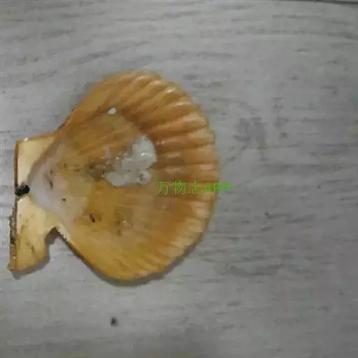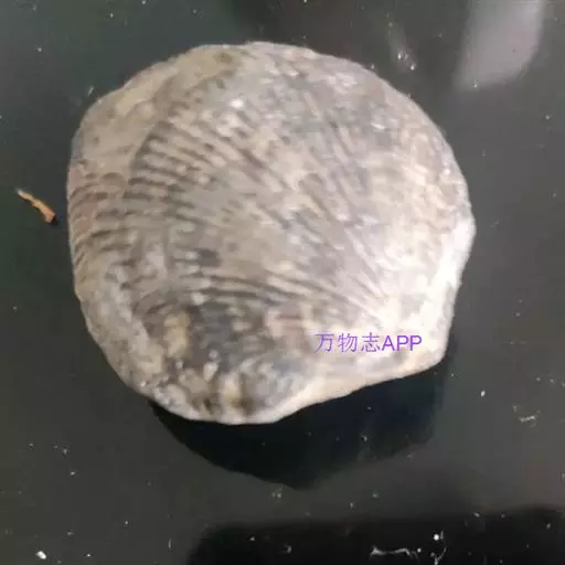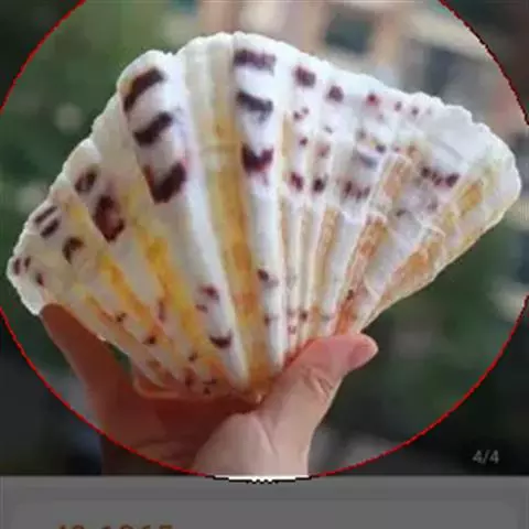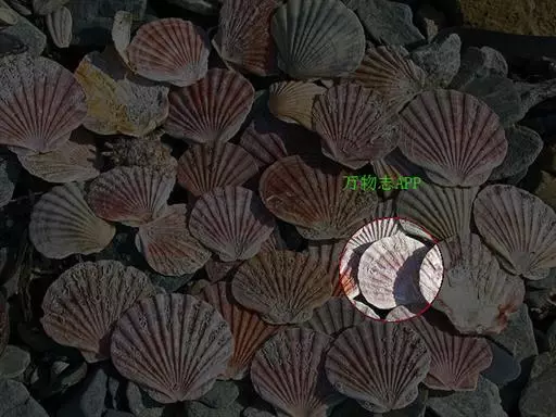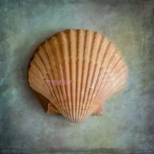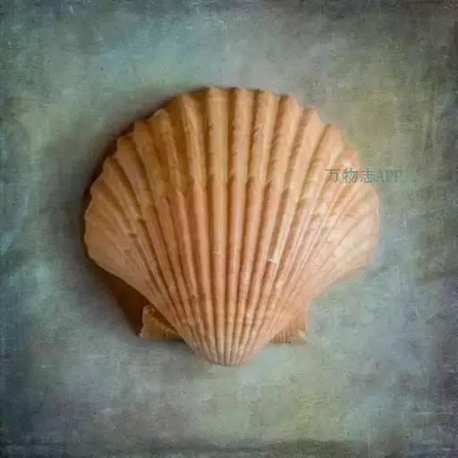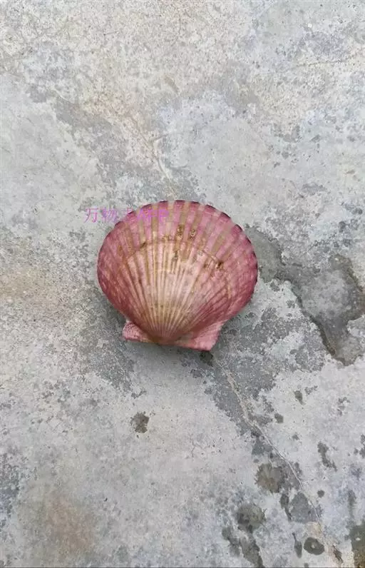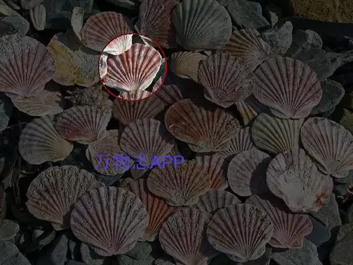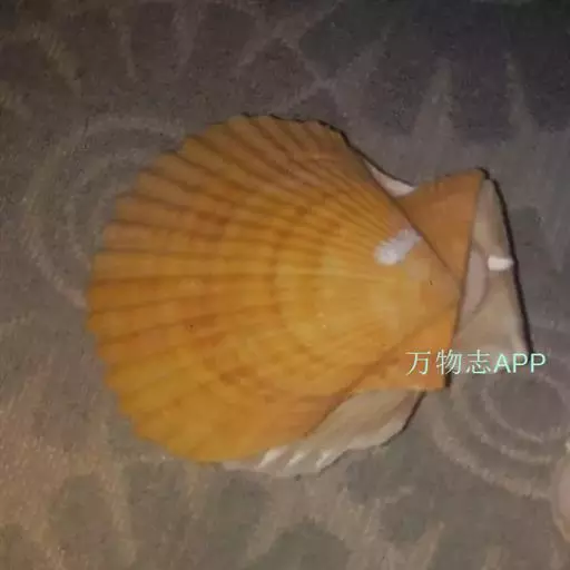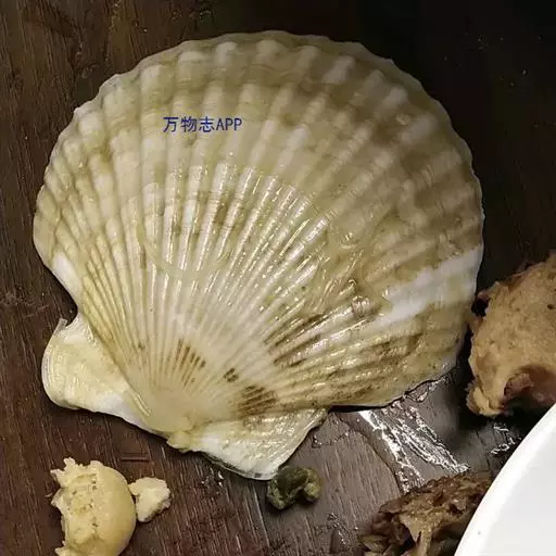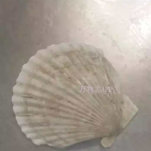 贝壳中等大小,壳质较薄,但很坚韧,呈圆形。壳较凸,两壳及壳两侧均略等,壳背缘较直,腹缘及前、后缘均呈圆形。两壳关闭时两侧略留有狭孔。壳顶尖、低,不突出壳背缘。壳顶前方和后方有壳耳左壳两耳略等右壳前耳略较后耳小,呈长方形其他皆呈三角形足丝孔位于右壳前耳下方,较小,呈三角形,具数枚细栉柿齿。壳表多呈灰褐色或浅黄褐色,具深褐色或紫褐色云状花斑,一般左壳的颜色较浅而右壳较深。两壳面皆布满放射肋肋呈圆形,较光滑,约有18条左右,肋上的生长小棘较低平左壳肋较窄,肋间距离较宽右壳相反,肋较宽而肋间距离较窄。贝壳内面色浅,略近白色,稍具光泽闭壳肌痕略显,近圆形有与壳面相应的肋与沟。铰合部较细长,韧带深褐色,位于三角形的韧带槽中,中央关节较明显。