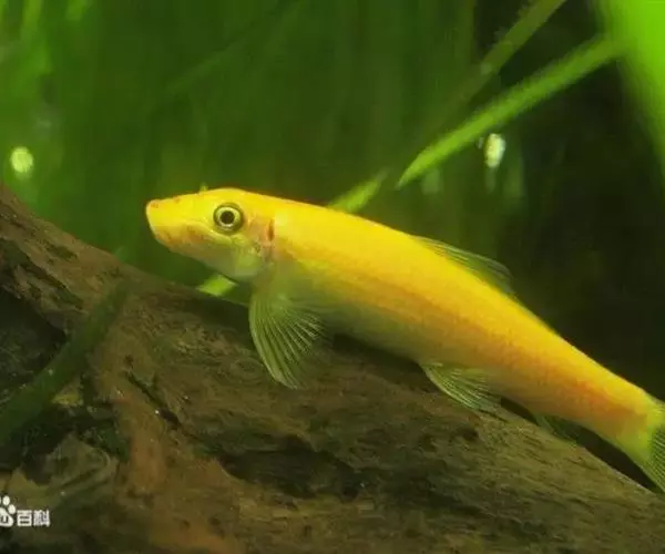 浑身是金色的,属于无鳞鱼。体细长,稍侧扁。身体最高处在胸鳍起点垂直上方,向前急剧下斜,向后较平直,头长,侧扁。吻前端略尖。眼上位,腹视不可见,明显位于头的后半部。口下位,上唇边缘有发达而稀疏的突起,侧端连于口角须的基部。唇后沟根深。须3对,吻须2对,口角须1对。背鳍外缘微凸;胸鳍左右基部紧靠在一起;腹鳍短小,左右基部紧靠;臀鳍短;尾鳍深凹。吻端至眼前缘有两黑色纵条纹,各鳍浅棕色,无斑。体长可达180毫米。