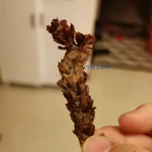 干燥果穗呈长圆柱形或宝塔形,长2.5~6.5cm,直径 1~1.5cm,棕色或淡紫褐色。宿萼数轮至十数轮,作覆瓦状排列,每轮有5-6个具短柄的宿萼,下方对生苞片2枚。苞片肾形,淡黄褐色,纵脉明显,基部楔形,先端尖尾状,背面生白色粗毛。宿萼唇形,上唇宽广,先端微3裂,下唇2裂,裂片尖三角形,外面有粗毛。花冠及雄蕊都已脱落。宿萼内有小坚果4枚,棕色,有光泽。体轻质脆,微有清香气,味淡。以色紫褐、穗大者为佳。 长冠夏枯草 本品与夏枯草相亿,但花冠较长,18~221mm。