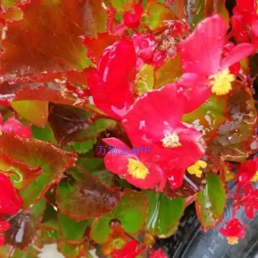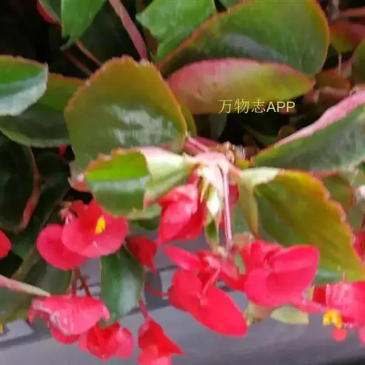 多年生常绿草本,茎直立,稍肉质,高15-30厘米。单叶互生,有光泽,卵圆至广卯圆形,长5-8厘米,宽3-6厘米,先端急尖或钝,基部稍心形而斜生,边缘有小齿和缘毛,绿色。聚伞花序腋生,具数花,花红色,淡红色或白色。蒴果具翅。花期3-12月。 四季秋海棠
