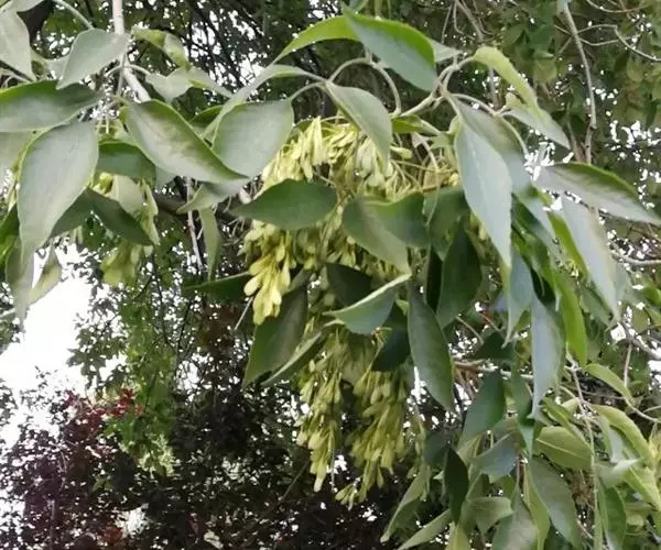 圆锥花序顶生或腋生枝梢,长8-10厘米;花序梗长2-4厘米,无毛或被细柔毛,光滑,无皮孔;花雌雄异株;雄花密集,花萼小,钟状,长约1毫米,无花冠,花药与花丝近等长;雌花疏离,花萼大,桶状,长2-3毫米,4浅裂,花柱细长,柱头2裂。