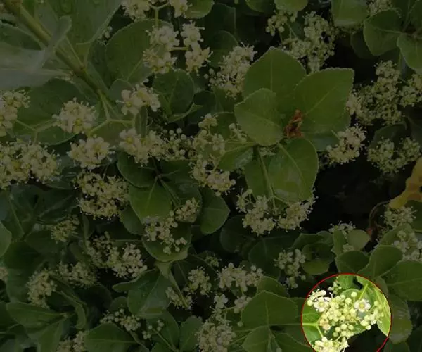 聚伞花序5-12花,花序梗长2-5厘米,2-3次分枝,分枝及花序梗均扁壮,第三次分枝常与小花梗等长或较短;小花梗长3-5毫米;花白绿色,直径5-7毫米;花瓣近卵圆形,长宽各约2毫米,雄蕊花药长圆状,内向;花丝长2-4毫米;子房每室2胚珠,着生中轴顶部。