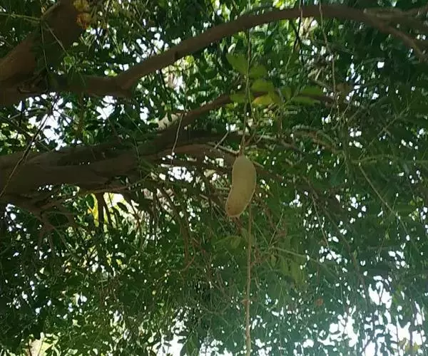 乔木,高13-20米,枝下高约2米,胸径约1米 。奇数羽状复叶交互对生或轮生,叶轴长7.5-15厘米;小叶7-9枚,长圆形或倒卵形,顶端急尖,基部楔形,全缘,叶面光滑,亮绿色,背面淡绿色,被微柔毛,近革质,羽状脉明显。圆锥花序生于小枝顶端,花序轴下垂,长50-100厘米;花稀疏,6-10朵。花萼钟状,革质,长4.5-5厘米,直径约2厘米,3-5裂齿不等大,顶端渐尖。花冠桔黄色或褐红色,裂片卵圆形,上唇2片较小,下唇3片较大,开展,花冠筒外面具凸起纵肋。雄蕊4,2强,外露,花药个字形着生,药室2,纵裂。花盘环状。柱头2裂,子房1室,胚珠多数。果下垂,圆柱形,长38厘米左右,直径12-15厘米,坚硬,肥硕,不开裂,果柄长8厘米。种子多数,无翅,镶于木质的果肉内。