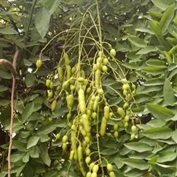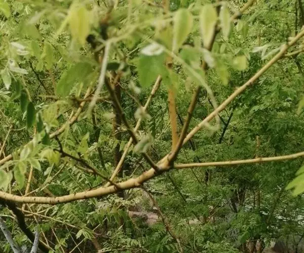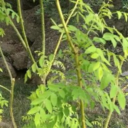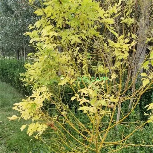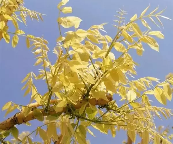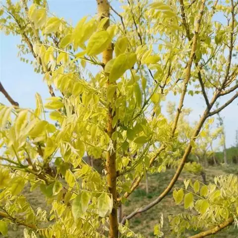 金枝槐树茎、枝一年生为淡绿黄色,入冬后渐转黄色,二年生的树茎、枝为金黄色,树皮光滑;叶互生,6~16片组成羽状复叶,叶椭圆形,长2.5~5厘米,光滑,淡黄绿色。树干墙直,树形自然开张,树态苍劲挺拔,树繁叶茂;主侧根系发达。生长快,当年嫁接苗可长1.5~2米高,第二年2.5~3.5米;性耐寒,能抵抗-30℃的低温;抗干旱性强,耐瘠薄。
