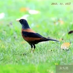 灰头鸫:中型鸟类,体长23-27厘米。整个头、颈和上胸褐灰色,两翅和尾黑色,上、下体羽栗棕色。…
