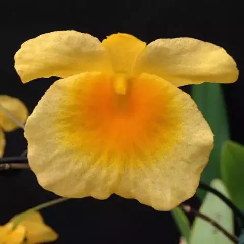 花瓣阔长圆形,长3厘米,宽1.5厘米,先端钝,基部近楔形收狭,边缘具细齿,具6条脉和多数支脉;唇瓣白色,中部以下金黄色,上部紫红色,近圆形,长约2.5厘米,中部以下两侧围抱蕊柱,基部具很短的爪,边缘具睫毛,两面被短绒毛;蕊柱长约4毫米,下部扩大,背面稍被细乳突;药帽近圆锥形,被细乳突状毛,前端稍收狭而近截形并具啮蚀状。花期3-4月。