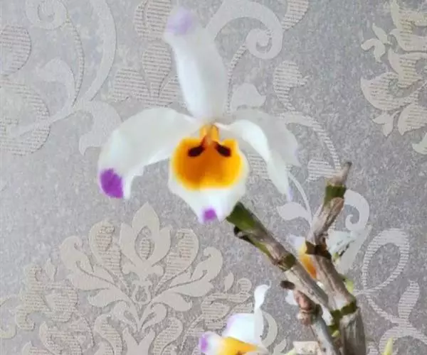 总状花序通常出自落了叶的老茎上部,具1-3朵花;花序柄较粗短,长2-5毫米,基部被1-2枚长约6毫米的筒状鞘;花苞片浅白色,纸质,宽卵形,长约8毫米,先端钝;花梗黄绿色,连同淡紫红色的子房长3-4厘米;花大,白色,上部紫红色,开展,具香气,干后蜡质状;中萼片长圆形,长约3厘米,宽1厘米,先端锐尖,具5条脉;侧萼片与中萼片等大,同形,先端锐尖,基部稍歪斜,具5条脉;萼囊紫红色,近圆锥形,长约5毫米。