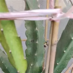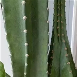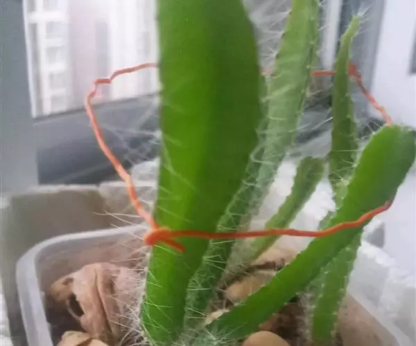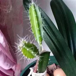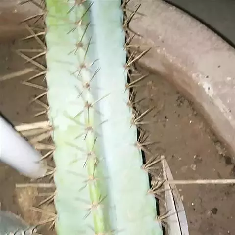 用利刀在霸王花的三棱柱适当高度横切一刀,然后将三个棱峰作30-40度切削,用消过毒的仙人刺刺入砧木中间维管束,将切平的接穗连接在刺的另一端,用刺将接穗和砧木连接起来,砧木和接穗尽量贴紧不留空隙,避免细菌感染不利愈合,然后在两旁各加一刺固定,再用细线绕基部捆紧。
