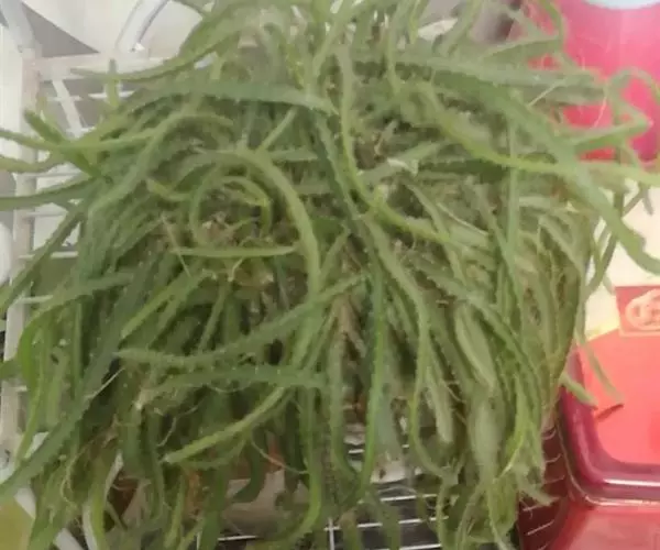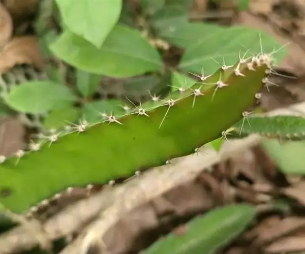 火龙果为多年生攀援性的多肉植物。植株无主根,侧根大量分布在浅表土层,同时有很多气生根,可攀援生长。根茎深绿色,粗壮,长可达7米,粗10-12厘米,具3棱。棱扁,边缘波浪状,茎节处生长攀援根,可攀附其他植物上生长,肋多为3条,每段茎节凹陷处具小刺。由于长期生长于热带沙漠地区,其叶片已退化,光合作用功能由茎干承担。茎的内部是大量饱含粘稠液体的薄壁细胞,有利于在雨季吸收尽可能多的水分。