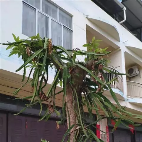 4.修剪枝条:每年采果后剪除结过果的枝条,让其重新发出新枝,以保证来年的产量。火龙果种植方式多种多样,可以爬墙种植,也可以搭棚种植,但以柱式栽培最为普遍,其优点是生产成本低、土地利用率高。