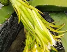花白色,巨大子房下位,花长约30厘米,故又有霸王花之称。花萼管状,宽约3厘米,带绿色(有时淡紫色)的裂片;具长3-8厘米的鳞片;花瓣宽阔,纯白色,直立,倒披针形,全缘。雄蕊多而细长,多达700-960条,与花柱等长或较短。花药乳黄色,花丝白色;花柱粗,0.7-0.8厘米,乳黄色;雌蕊柱头裂片多达24枚。