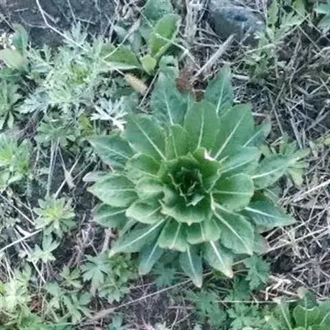 基生叶莲座状,倒披针形,长15-25厘米,宽4-5厘米,先端锐尖或稍钝,基部渐狭并下延为翅,边缘自下向上有远离的浅波状齿,侧脉5-8对,白色或红色,上部深绿色至亮绿色,两面被曲柔毛与长毛;叶柄长3-4厘米;茎生叶螺旋状互生,狭椭圆形至披针形,自下向上变小,长5-13厘米,宽2.5-3.5厘米,先端锐尖或稍钝,基部楔形,边缘疏生远离的齿突,侧脉8-2对,毛被同基生叶的;叶柄长2-15毫米,向上变短 。