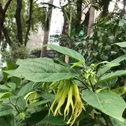 依兰 常绿大乔木,高达20多米,胸径达60厘米;树干通直,树皮灰色;小枝无毛,有小皮孔。叶大,膜质至薄纸质,卵状长圆形或长椭圆形,长10-23厘米,宽4-14厘米,顶端渐尖至急尖,基部圆形,叶面无毛,叶背仅在脉上被疏短柔毛;侧脉每边9-12条,上面扁平,下面凸起;叶柄长1-1.5厘米。