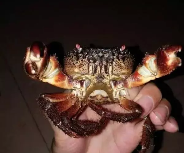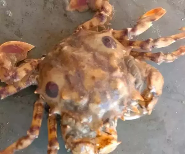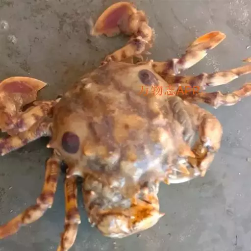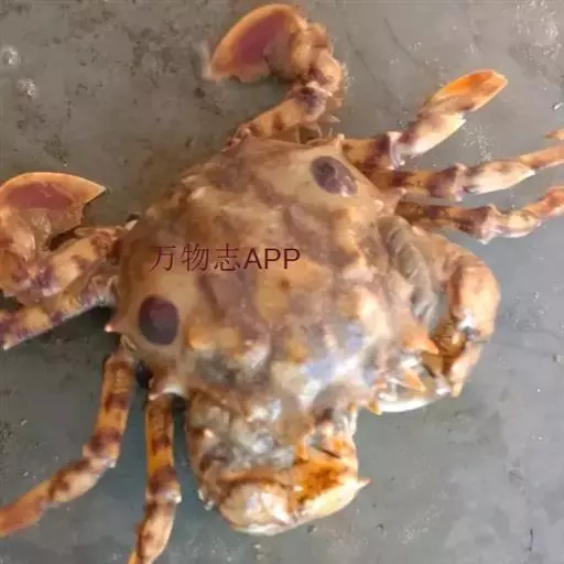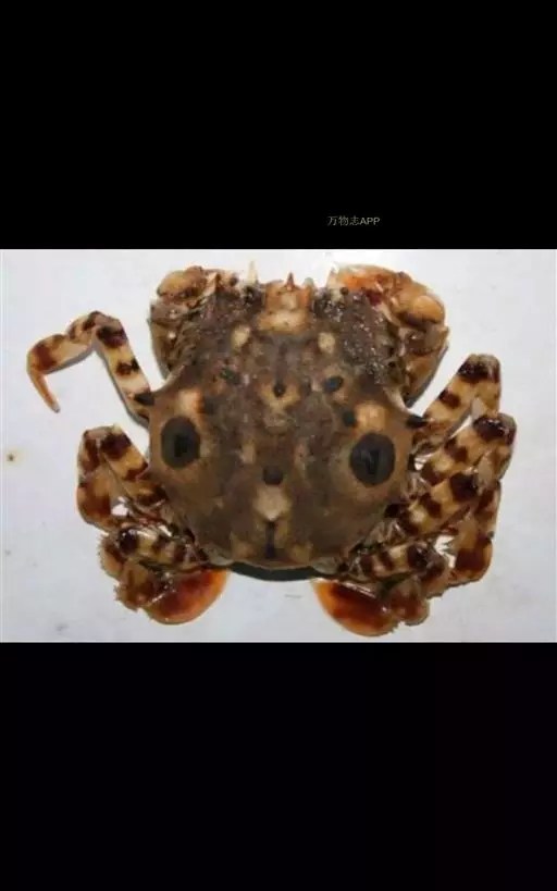 中华虎头蟹色泽鲜艳,头胸甲呈圆形,两鳃区各有1个深紫色乳斑,整个外形与老虎头部非常相似,尤其那两个深紫色的乳斑就像老虎的一对大眼,以此而得名。