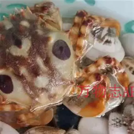 中华虎头蟹(学名:Orithyia sinica)是虎头蟹科、虎头蟹属甲壳类动物;外形奇特,色泽鲜艳,头胸甲圆形,表明有颗粒状隆起在前部及中部特别显著;鳃区各有一个呈深紫色圆斑,如虎眼状;额部窄,具3锐齿,中部较大而突出长度稍大于宽度;分区明显,疣状突起对称地分布于各区中心;额具3个锐齿,居中者较大,前侧缘具2个疣状突起及一壮刺,后侧缘具两壮刺,后缘圆钝;螯足不对称,左大右小;第4对步足呈桨状,指节扁平卵圆形;腹部雄性短小呈三角形,雌性卵圆形。