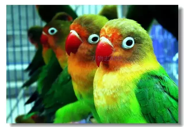 黄领牡丹鹦鹉:是一种小型的鹦鹉。体长14-15厘米,体重43-47克。颜色鲜艳,体形胖乎乎如桃脸牡丹鹦鹉,头较大,显得体态短小。野生的黄领牡丹鹦鹉头部为黑色,犹如戴上黑头罩。它的颈部和胸部为黄色,背部、翅、尾和腿是绿色。跗跖很短,脚灰色较粗大。黄领牡丹鹦鹉的显著特征是白眼圈和红色的鸟喙。