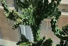 麒麟掌,是大戟科大戟属多年生植物。为金刚纂的带化变异变种。麒麟掌的株乳汁丰富;它的茎圆柱状,上部多分枝,绿色;叶互生,稀少,常生于嫩枝顶端脊上,倒卵形、倒卵状长圆形或匙形,顶端钝圆,具小凸尖,全缘,…全部>>