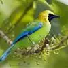 金额叶鹎是和平鸟科、叶鹎属的鸟类。体长16-20厘米。额和头顶前部金桔色,整个上体包括两翅表面草绿色。颏、喉黑色,其外围有一圈黄色,其余下体浅绿色,翼缘蓝紫色,翅上小覆羽翠蓝色。野外特征极明显,…全部>>