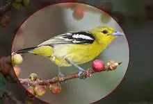 黑翅雀鹎:体重14-19克,体长11.5-16厘米。是树栖性绿色小鸟,外形与叶鹎相似,下体黄色。鸟喙直,翼长而尖,总体羽毛是绿色和黄色相结合,翼上具两道明显近白色横纹,翼近黑而羽缘白。…全部>>