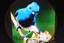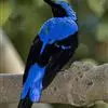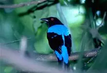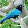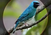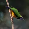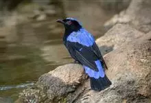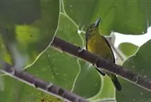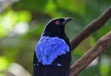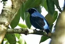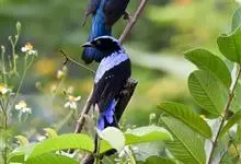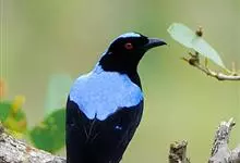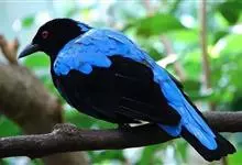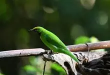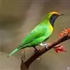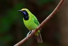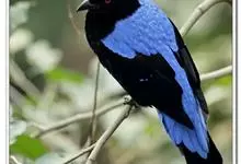 蓝翅叶鹎:小型鸟类,体长15-18厘米。雄鸟通体草绿色,尾蓝绿色,肩和翅亮蓝 色,胸缀有黄色,颏、喉黑色。雌鸟颏,喉蓝绿色。栖息在海拔1500米以下的常绿阔叶林、次生林和林缘疏林灌丛中。…全部>>