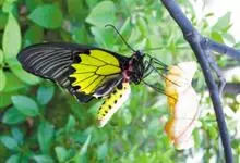 金裳凤蝶是凤蝶科、裳凤蝶属的动物。金裳凤蝶身体呈黑色,头、颈和胸侧有红毛,腹部有黑黄两色相间条纹,雄蝶前翅黑色,具黑天鹅绒光泽,各脉两侧灰白色,后翅金黄色,各室外缘有等腰三角形黑斑1枚,斑内侧有晕,…全部>>