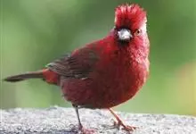 酒红朱雀小型鸟类,体长13~15厘米。雄鸟通体深红色,头部深朱红或棕红色,下背和腰玫瑰红色,眉纹粉红色而具丝绢光泽。两翅和尾黑褐或灰褐色、具暗红色狭缘,内侧两枚三级飞羽具淡粉红色先端。…全部>>