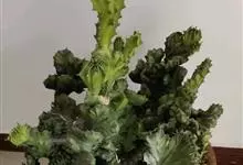 麒麟掌,是大戟科大戟属多年生植物。为金刚纂的带化变异变种。麒麟掌的株乳汁丰富;它的茎圆柱状,上部多分枝,绿色;叶互生,稀少,常生于嫩枝顶端脊上,倒卵形、倒卵状长圆形或匙形,顶端钝圆,具小凸尖,全缘,…全部>>