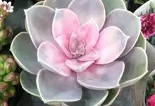 紫珍珠是景天科石莲花属的多年生肉质草本植物。植株中小型;叶片肉质,匙形,呈莲座状紧密排列;叶片粉紫色,叶缘呈粉白色,光照充足时颜色亮丽,不足时叶色会呈现深绿色或灰绿色,叶面光滑,被轻微白粉,…全部>>