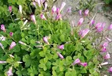 红花酢浆草别名铜锤草、大酸味草、幸运草等,是酢浆草科酢浆草属的多年生直立草本植物。其无地上茎,地下部有球状鳞茎;叶基生,叶柄长5~30cm或更长,被毛;花瓣5,倒心形,淡紫色至紫红色,基部颜色较深。…全部>>