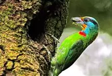 绿拟啄木鸟为鴷形目,须科,拟啄木属的一种。形较大拟啄木鸟略小,体长约260mm。头、颈及胸浅褐而具淡黄白色条纹;喉几为淡黄白色;身体余部草绿色。虹膜棕褐色,眼周裸露部黄色;嘴峰角黄色;跗跖和趾角黄…全部>>