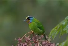 黑眉拟啄木鸟,为须䴕科、拟啄木鸟属的小型鸟类,体长20-25厘米,外形和金喉拟啄木鸟非常相似,但具粗著的黑色眉纹,头侧和耳覆羽以及下喉蓝色而不为银灰色,前颈两侧各有一块鲜红色斑。全部>>