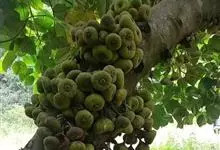 大果榕是桑科榕属的小乔木,株高可达10米;幼枝被柔毛;叶互生,宽卵状心形或近圆形;雄花无梗、匙形、花丝长,雌花生于雌株榕果内,子房白色;榕果簇生于树干基部或老茎短枝上、扁球形或陀螺形,…全部>>