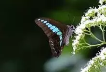 青带凤蝶Graphium sarpedon ,又名青凤蝶,是最普遍的中型凤蝶,飞行速度很快。青带凤蝶的翅膀中央有许多浅蓝色的斑点,很整齐地排列成一条直线。这些斑点由上而下逐渐变大,就像一条青色的带子。全部>>