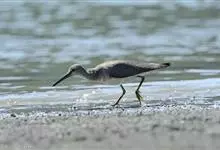 红脚鹬:体长28厘米,上体褐灰,下体白色,胸具褐色纵纹。飞行时腰部白色明显,次级飞羽具明显白色外缘。尾上具黑白色细斑。虹膜黑褐色,嘴长直而尖,基部橙红色,尖端黑褐色。脚较细长,亮橙红色,…全部>>