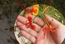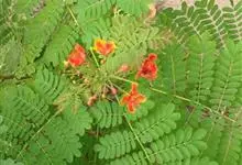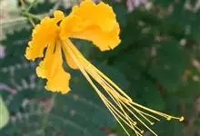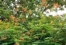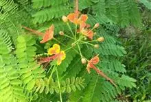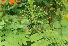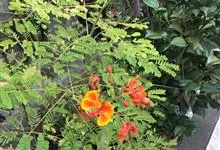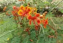 洋金凤 Sw.),豆科小凤花属灌木状或小乔木植物,枝无毛,绿或粉绿色;二回羽状复叶;总状花序伞房状,萼片无毛,花瓣橙红或黄色,圆形,花丝红色,子房无毛,花柱橙黄色;荚果窄而薄,…全部>>