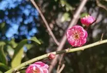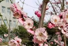 宫粉梅 Rehd.)是蔷薇科、李属植物,梅花品系中真梅系直枝梅类宫粉型,其花复瓣至重瓣,呈或深或浅的红色。落叶乔木,高达10米。树干褐紫色,有纵驳纹,小枝细而无毛,多为绿色。叶广卵形至卵形,…全部>>