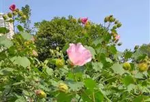 海滨木槿是锦葵科木槿属植物,落叶小乔木,株高3-5米,胸径20厘米,扁球形树冠,枝叶繁盛。厚纸质单叶互生,扁圆形、倒卵形或宽倒卵形,先端钝近平,具短突尖,基部圆形或浅心形,叶缘中上部具细圆齿,…全部>>