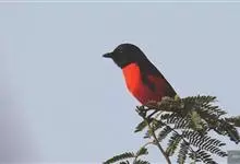 灰喉山椒鸟:共有8个亚种。体长18-22厘米。雄鸟头部和背亮黑色,腰、尾上覆羽和下体朱红色,翅黑色具一大一小的两道朱红色翼斑。中央尾羽黑色,外侧尾羽基部黑色,端部红色。…全部>>