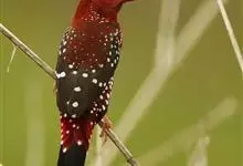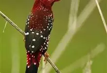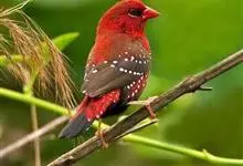 红梅花雀小型鸟类,体长9-10厘米。雄鸟通体朱红色,背、肩、胸等满布白色小斑点,两翅和尾黑褐色均具白色端斑,嘴红色,脚蜡黄色。雌鸟上体淡褐色或赭褐色,翅上中覆羽、大覆羽和内侧飞羽末端具白色斑点,…全部>>