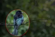 发冠卷尾是中型鸟类,体长28-35厘米。通体绒黑色缀蓝绿色金属光泽,额部具发丝状羽冠,外侧尾羽末端向上卷曲。栖息于海拔1500米以下的低山丘陵和山脚沟谷地带,多在常绿阔叶林、次生林或人工松林中活动。…全部>>